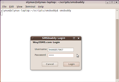 Once you install the SMSbuddy, you can execute it using the command, ‘smsbuddy’ During first run, it will ask for login username and password. You can issue you Way2SMS.com username and password. From the very next run, it will not prompt for authentication. Once if you need to change the account used by default, use File->Login to change the default account. From File->Contacts option, you can add contacts of your friends with name and mobile number. Once the SMSbuddy is started, it initiates login. You can see status message in the status bar. You can select the contacts you added using contacts dialog and send SMS. Download it from here code removed